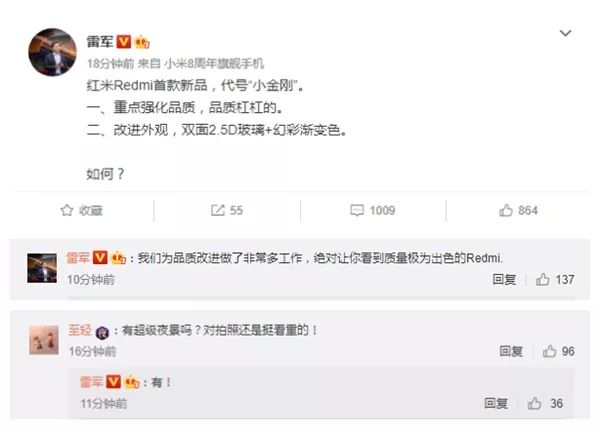 说到红米,小米科技创始人兼CEO雷军微博发声:全新独立品牌红米Redmi首款新机代号为“小金刚”,它有两大改进。一是重点强化品质,质量杠杠的,二是改进外观,双面2.5D玻璃+幻彩渐变色。