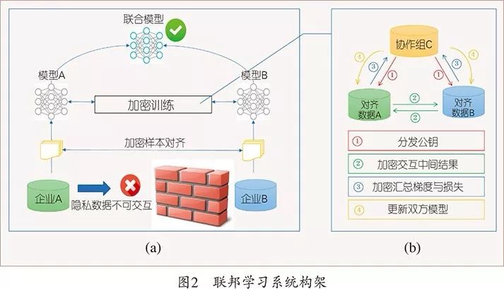 我们以包含两个数据拥有方(即企业A和B)的场景为例介绍联邦学习的系统构架。该构架可扩展至包含多个数据拥有方的场景。假设企业A和B想联合训练一个机器学习模型,它们的业务系统分别拥有各自用户的相关数据。此外,企业B还拥有模型需要预测的标签数据。出于数据隐私保护和安全考虑,A和B无法直接进行数据交换,可使用联邦学习系统建立模型。联邦学习系统构架由三部分构成,如图2(a)所示。