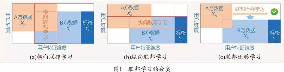 为了应对以上三种数据分布情况,我们把联邦学习分为横向联邦学习(horizontal federated learning)、纵向联邦学习(vertical federated learning)与联邦迁移学习(Federated Transfer Learning, FTL) [2](如图1)。