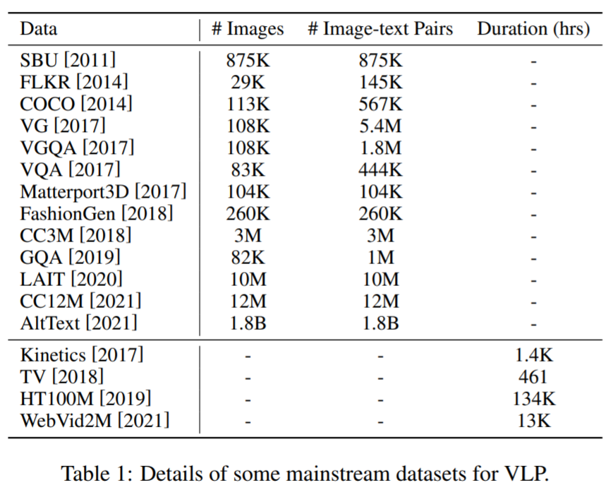 方面:大多数用于 VLP 的数据集是通过组合跨多模态任务的公共数据集构建而成。这里,一些主流语料库及其详细信息如下表 1 所示。