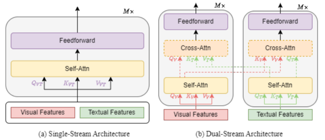是指将文本和视觉特征组合在一起,然后馈入单个 transformer 块,如下图 1 (a) 所示。单流架构通过合并注意力来融合多模态输入。单流架构的参数效率更高,因为两种模式都使用相同的参数集。