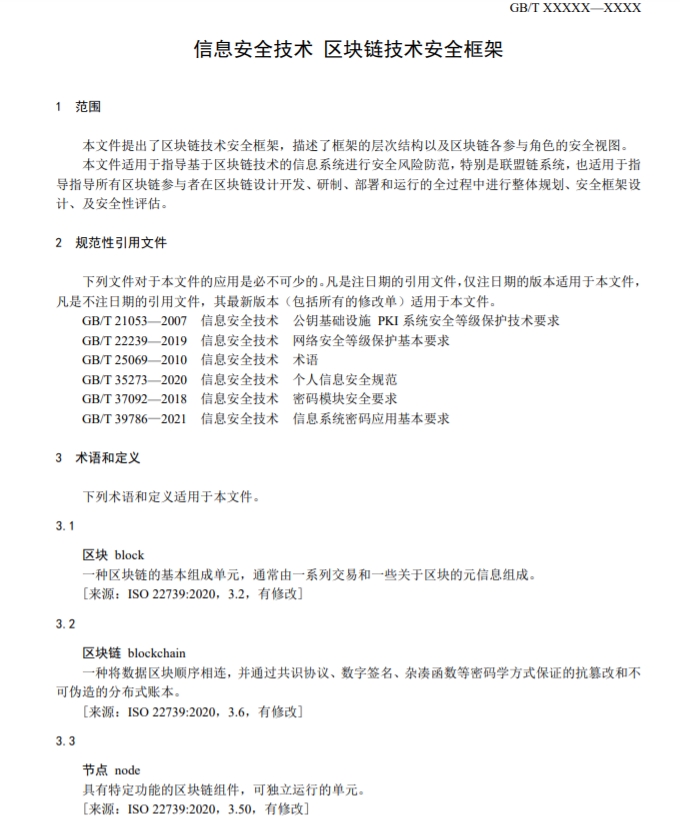 《信息安全技术区块链技术安全框架》国家标准,本标准本文件提出了区块链技术安全框架,描述了框架的层次结构以及区块链各参与角色的安全视图。本文件适用于指导基于区块链技术的信息系统进行安全风险防范,特别是联盟链系统,也适用于指导指导所有区块链参与者在区块链设计开发、研制、部署和运行的全过程中进行整体规划、安全框架设计、及安全性评估。
