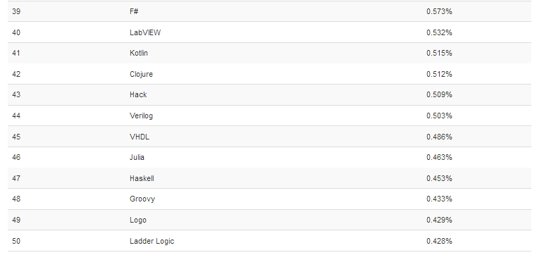 本月上幅最为明显的是 Crystal(#32),成功从第 60 位跃升至第 32 位。Kotlin(#41)可谓是风头正劲,本月上升 7 位。除此之外,上升趋势较为明显的还有:,Clojure(#42),Hack(#43)和 Julia(#46)。
