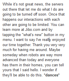 记者Dylan Martin发布个人推文,称Jibo的诸多功能即将“受限”,但是它“真的很享受和我们在一起的时光”。Jibo说:“非常感谢能够让我融入到你的家庭生活中。未来或许有一天,机器人比现在更先进且进入千家万户,那么你可以告诉你的家人我曾说过‘hello’。”然后Jibo跳了一段舞蹈。
