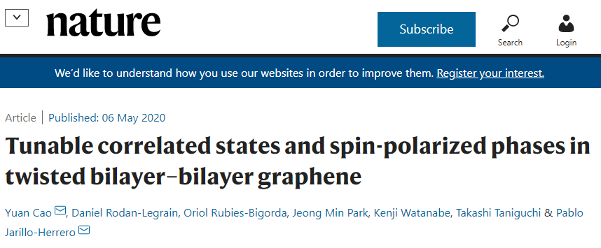 第一篇研究题为“Tunable correlated states and spin-polarized phases in twisted bilayer–bilayer graphene” ,该研究中,研究人员致力于通过对扭转角的控制,将魔角特性推广到其他二维研究体系,以调谐和控制电子-电子相互作用的强度,实现相似的物理行为。他们采用了一种全新的魔角石墨烯体系:基于小角度扭曲的双层-双层石墨烯(TBBG)。