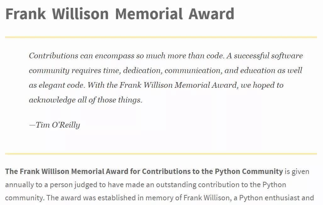 注:弗兰克·威利森纪念奖,即 Frank Willison Memorial Award,该奖由 O'Reilly 出版集团设立,颁布给为 Python 社区做了突出贡献的个人。设立于2002年,每年颁布一次。