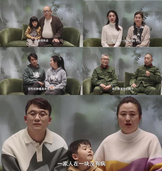 在该视频中,五组不同身份的嘉宾参与了一段“敏感问题”的访谈——分享各自最珍惜的事及愿望。对话里,一起相依为命的母女珍惜和家里人在一起的时刻;爷孙里的爷爷最怕失去和家人分开;两个已经年迈的老战友则愿能再多活十几年,一起走遍祖国的大好山河;三口之家希望一家人健健康康;重获健康的夫妻则害怕失去对方……