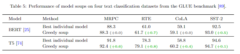 为了测试通过模型汤获得的模型性能提升是否可以扩展到图像分类以外的领域,研究人员还对NLP任务进行了实验。研究人员在四个文本分类任务上对BERT和T5模型进行了微调,这些任务来自于GLUE基准:MRPC,RTE,CoLA和SST-2。实验结果虽然改进没有图像分类中那么明显,但贪婪汤在许多情况下可以比最好的单模型性能更好。