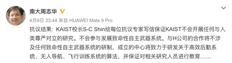 在联合国正在讨论如何遏制自主武器对国际安全构成的威胁时, 我们非常遗憾的看到, 像韩国科学技术院这样的著名机构似乎在加速军备竞赛, 以发展这类武器。因此, 我们在这里公开宣布, 我们将抵制与韩国科学技术院相关的所有合作, 直到韩国科学技术院负责人向我们保证,该中心将不会研发完全自主,不需要人类控制的「机器人杀手」。例如, 我们将不再访问韩国科学技术院, 接待韩国科学技术院的学者, 或参与任何涉及韩国科学技术院的研究项目。