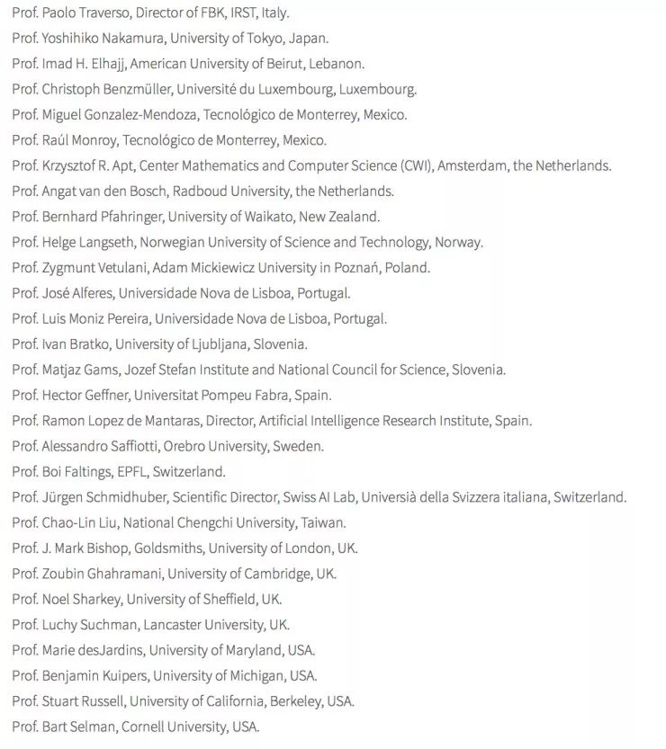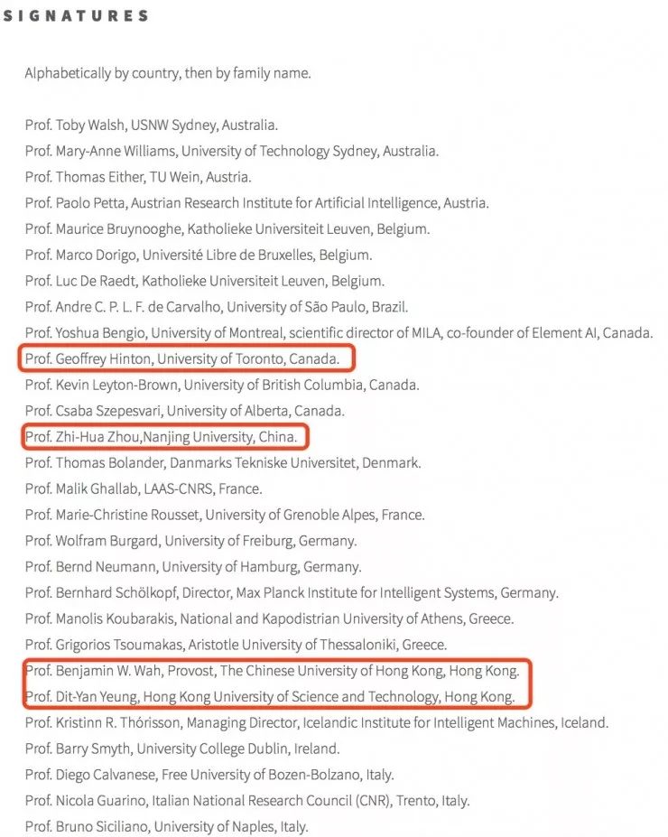 最早发出呼吁的是 AI 领域著名的澳大利亚学者 Toby Walsh,其后有近 60 名从事机器人和 AI 研究的专家表示赞同。其中最著名的有多伦多大学 Geoffrey Hinton、蒙特利尔大学 Yoshua Bengio、瑞士人工智能实验室 Jürgen Schmidhuber、加州大学伯克利分校 Stuart Russell、南京大学的周志华教授,香港中文大学的华云生教授、香港科技大学的杨瓞仁教授等人。南京大学人工智能学院院长、计算机系教授周志华是唯一一名内地学者。