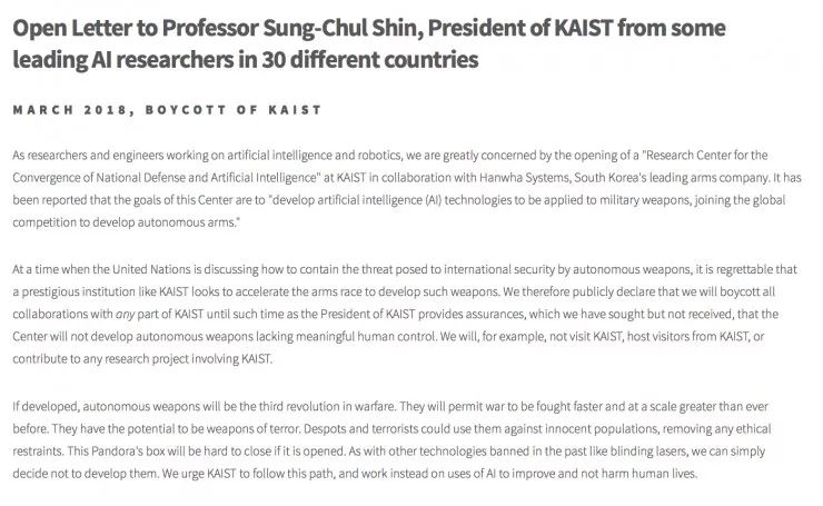 作为 AI 和机器人技术的研究员和工程师, 我们对韩国科学技术院(Korea Advanced Institute of Science and Technology)与韩国军工企业韩华系统(Hanwha Systems)合作建立的「国防与人工智能融合研究中心」(Research Center for the Convergence of National Defense and Artificial Intelligence)表示极大的担忧。据报道, 该中心的目标是「开发可用于军事武器的人工智能技术, 加入全球研发自主武器(autonomous weapon)的军备竞赛」。