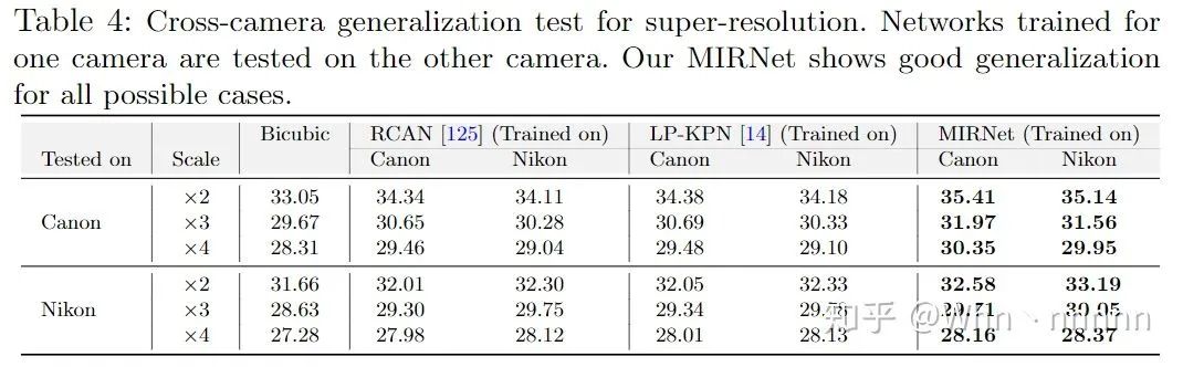 By the way,由于文章略长,MIRNet在去噪,超分,增强方面均可以应用,对比数据较多,所以这里只截取了一部分图片,可以在文章中和Supplementary中找到更详细的结果对比。此外,文章中在三个应用领域部分分别提及了模型的泛化能力(generalization),这里也只做一个综述:去噪方面,SIDD和DND数据集中的图片有着不同特征的噪声,而训练时仅使用SIDD训练集,模型在SIDD和DND测试集上均表现良好,证明了MIRNet良好的泛化能力;超分辨率方面,使用Canon和Nikon两种相机的图片进行了一个交叉实验,验证了MIRNet的泛化能力较强。