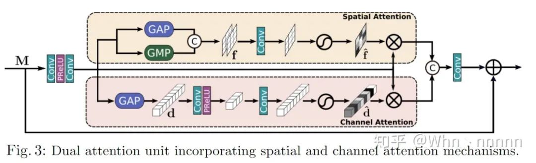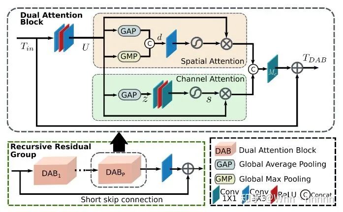 SKFF模块可以在多分辨率分支上融合信息,那么还需要一种在空间和通道维度上与特征张量进行信息共享的机制,此处作者提出了对偶注意力单元(dual attention unit,DAU)用来提取卷积流中的特征。DAU抑制作用较弱的特征,而仅允许带有更多信息的特征继续传递,DAU由CA(channel attention)和SA(spatial attention)两部分组成。