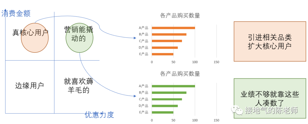 这里,这里会延伸出好几个话题,需要每一个话题单独做分析。比如用户分群,可以做矩阵分析,先锁定人群,再看其商品爱好(如下图):