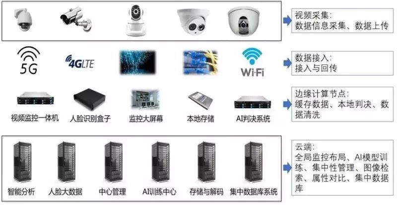 基于上述诉求,可以将监控数据分流到边缘计算节点(边缘计算 业务平台),从而有效降低网络传输压力和业务端到端时延。此外,视频监控还可以和人工智能相结合,在边缘计算节点上搭载 AI 人工智能视频分析模块,面向智能安防、视频监控、人脸识别等业务场景,以低时延、大带宽、快速响应等特性弥补当前基于 AI 的视频分析中产生的时延大、用户体验较差的问题,实现本地分析、快速处理、实时响应。云端执行 AI 的训练任务, 边缘计算节点执行 AI 的推论,二者协同可实现本地决策、实时响应,可实现表情识别、行为检测、轨迹跟踪、热点管理、体态属性识别等多种本地 AI 典型应用。