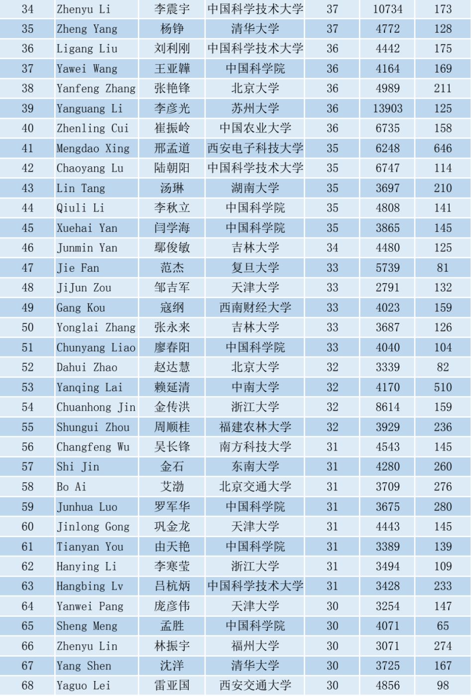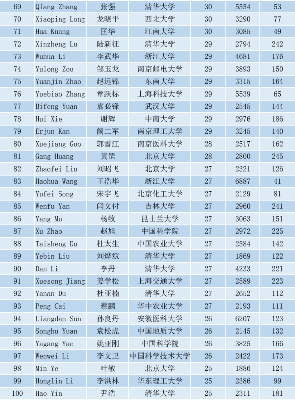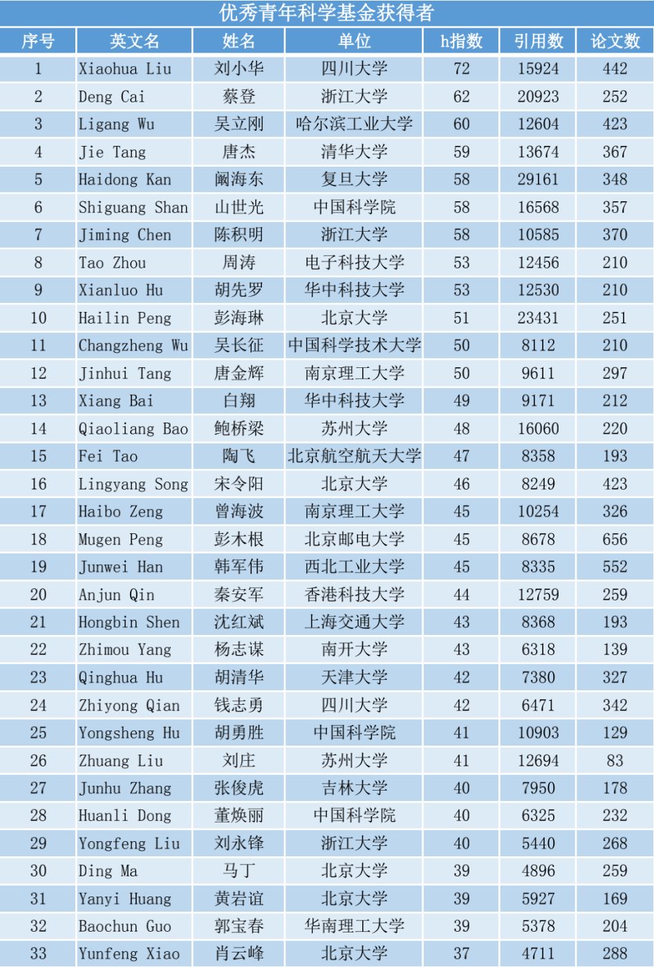 通过对各项数据进行统计分析,可以判别学者之间存在的共同点,查看优秀青年科学基金获得者所属的组织,以及其发表论文情况和影响力,为即将进行的决策提供进一步服务。收录的前 100 名优秀青年科学基金获得者如下(按 h 指数排名):