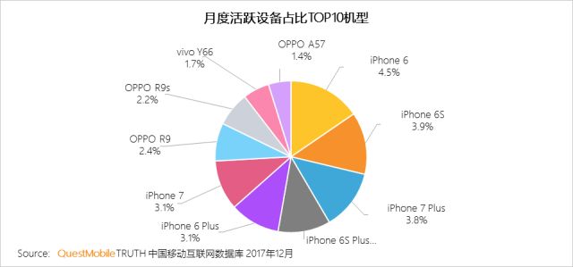 Top10智能终端的用户占比约30%,与去年基本一致。TOP6机型均为苹果手机,苹果之前霸主地位的影响仍延续到现在。除了苹果之外,OPPO也占据了三席,OPPOR9系列在中国市场热卖,抢夺了中高端市场的份额。