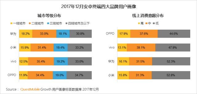 根据QuestMobile数据,华为手机的用户中一线城市用户占比显著较高,这与其品牌定位、营销推广有一定关系。小米手机的一线城市用户占比也较高,主要是因为小米多年来一直重点运营线上渠道,网购普及率较高的一线城市自然成为其重要的用户聚集地。OPPO、vivo深耕三四线城市多年,拥有强大的线下渠道,其三四线城市用户占比较高。但同时,随着华为、小米开始重视线下渠道,华为体验店、小米之家的快速布局,将在三四线城市与OPPO、vivo形成正面竞争。
