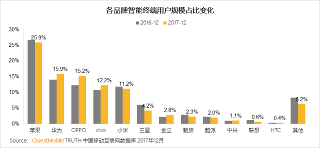 1月30日,专注于移动互联网研究的数据服务公司QuestMobile(贵土移动)发布了2017年中国智能终端报告,显示:华为、OPPO、vivo、小米的用户规模正在接近苹果,而三星则远远落后于这四家中国手机厂商。