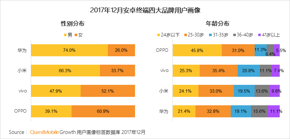 男性用户热衷华为/小米,女性用户青睐OPPO/vivo