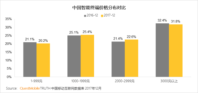 与之对比的则是1000元以下和3000元以上的终端占比均有所下降。