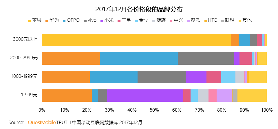 由于苹果手机定位就在3000元以上的市场,借助苹果庞大的用户基数,苹果基本垄断高端市场,OPPO、华为、vivo、三星抢夺剩余市场。1000-2999元核心市场中,华为、OPPO、vivo争锋相对,1000-1999元价格段三国鼎立,2000-2999元OPPO占据一定优势。在1-999元低端市场,小米凭借红米系列抢夺了较大市场份额,夯实在终端市场的用户基础。