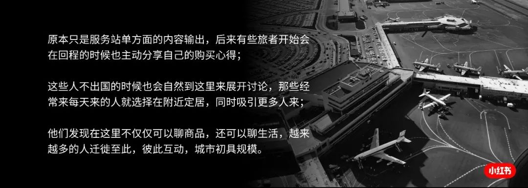然后有些游客在回程的时候也会尝试在这个机场的服务站有所逗留,主动分享一些自己刚刚结束的旅程的购买经验,因为这些分享比我们服务站原本提供的信息更加实时,这些分享者的叙述也更加生动,所以之后那些即将出行的人们也更愿意倾听之前游客们的分享,很自然的我们作为服务站就不再提供官方攻略信息了,但是服务站作为一个场所却吸引了越来越多的人,越来越多的准备出行的人会过来倾听,越来越多的旅途归来的人不愿离去,这个群体越来越大,一个服务站已经无法负荷,人们开始选择在附近定居,大家分享和交流的话题也不限于在海外买什么东西,开始讨论即使在国内有什么东西值得买,然后在日常生活中有什么餐厅酒店值得分享,学生党交流如何学英语如何考研,妈妈们交流如何备孕和培养宝宝,这样的正向循环和吸引力让越来越多的人迁徙至此,小红书这座城市也初具规模。