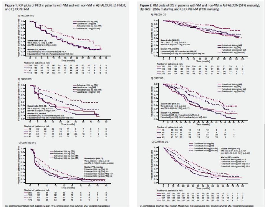 2.【FIRST/FALCON/CONFIRM内脏转移 VS 非内脏转移的亚组分析】相较于内脏转移患者,非内脏转移的HR+ABC患者更能从氟维司群500mg治疗中获益:这项研究纳入FIRST/FALCON/CONFIRM三项研究中绝经后的局部进展或转移性乳腺癌患者,旨在分析使用氟维司群500mg在内脏转移者与非内脏转移者中的疗效差异。结果显示,氟维司群500mg 较对照组在非内脏转移患者中明显改善患者的PFS、OS及CBR。在内脏转移患者中,氟维司群与对照组未见明显差异。