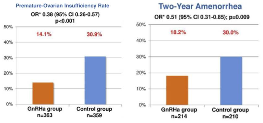 2. 【卵巢保护五个随机试验的汇总分析】化疗期间使用GnRHa可以有效保护卵巢功能并且不影响后续生存: 该研究共纳入5项随机临床实验873例患者数据进行分析,对早期乳腺癌患者在化疗期间使用GnRHa进行卵巢功能抑制的有效性(卵巢功能和生育保护)和安全性(生存结果)进行了探讨。结果显示:GnRHa显著降低POI的发生率, GnRHa组显著低于对照组﹙p<0.001﹚,其结果在各亚组中保持一致。GnRHa显著降低化疗后2年的闭经率(p=0.009)。化疗期间使用GnRHa进行短暂卵巢功能抑制可以显著提高治疗后续的怀孕率(10.3% VS 5.5%,IRR=1.83, 95%CI 1.06-3.15,p=0.03),实现怀孕者全部集中在≤40岁的年龄组。无论是ER+还是ER-乳腺癌,化疗期间使用GnRHa进行卵巢功能抑制并不会影响DFS(P=0.999)和OS(P=0.083) 。