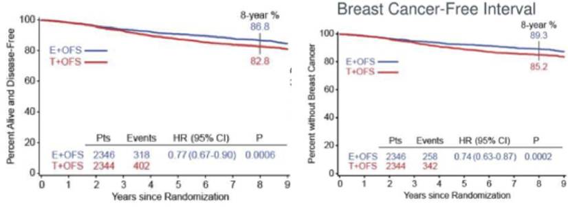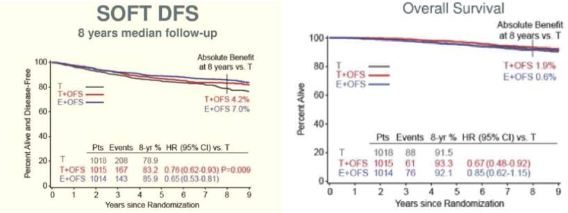 1. 【SOFT/ TEXT & SOFT联合分析8年随访数据更新】 OFS+TAM/AI显著改善绝经前激素受体阳性早期乳腺癌整体人群DFS,一举颠覆了之前整体人群阴性结果的结论。TEXT/SOFT联合分析继续强有力的证实OFS+AI优于OFS+TAM。