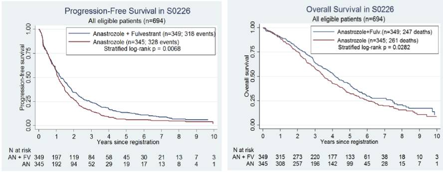 1.【SWOG0226研究】氟维司群联合阿那曲唑仍较单药阿那曲唑的使用显著的延长了PFS和OS:该Ⅲ期临床研究纳入694例绝经后激素受体阳性的转移性乳腺癌患者,旨在观察氟维司群250mg+阿那曲唑1mg对比阿那曲唑1mg一线治疗绝经后HR+MBC疗效。本次公布这项研究的最终生存分析,提示氟维司群联合阿那曲唑显著延长患者PFS(15.0 vs 13.5个月 p=0.007)。OS分析结果显示,氟维司群+阿那曲唑较阿那曲唑显著延长OS(50 vs 42个月, p=0.028 )。