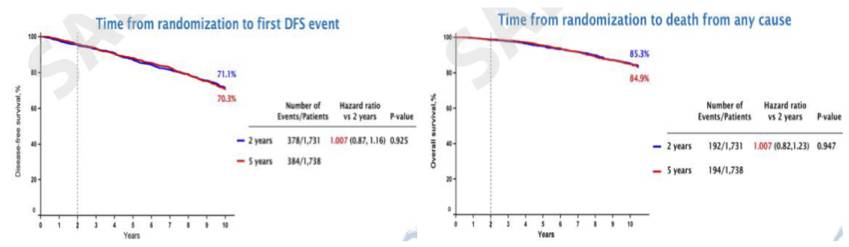 3.【ABCSG-16研究】完成5年辅助内分泌治疗后,再延长2年阿那曲唑治疗是充分的,延长到5年未见进一步获益:该研究是一项比较完成5年辅助内分泌治疗后,延长2年VS延长 5年阿那曲唑辅助治疗疗效的Ⅲ期研究,共纳入3,469名绝经后雌激素受体阳性早期乳腺癌患者。结果显示:5年辅助内分泌治疗后,阿那曲唑延长2年VS 延长5年的DFS及OS是无统计学差异,同样在对侧乳腺癌(HR=1.134, 95%CI 0.74-1.73, P=0.562)及第二原发癌的发生风险(HR=1.094,95%CI 0.85-1.40, P=0.477)亦无差异。延长5年阿那曲唑 VS延长2年,其骨折风险要高(P=0.029)。该研究认为,完成5年辅助内分泌治疗后,再延长2年阿那曲唑治疗是充分的,延长到5年没有进一步获益,反而增加骨折风险。