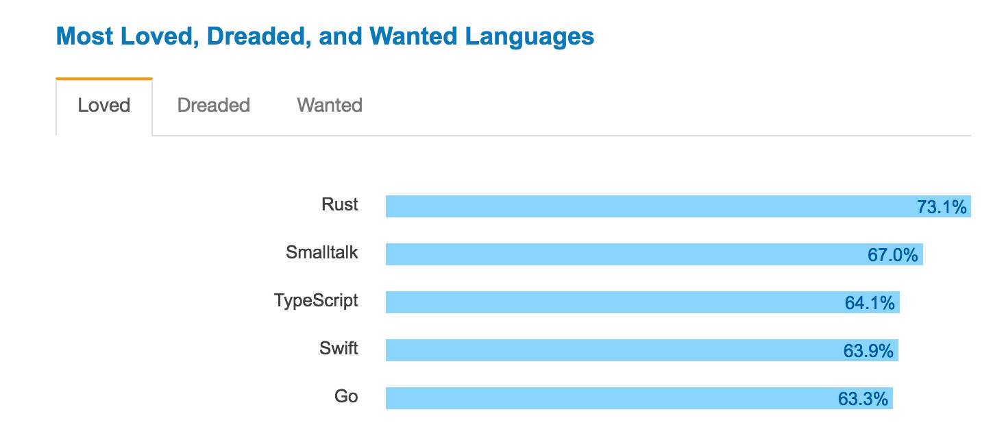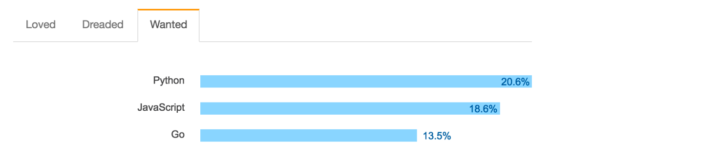 在 Stack Overflow's 2017 年开发者调查中,Go 是唯一一个同时位列“最喜爱的五种语言”和“最想使用的五种语言”的语言。正在使用它的人们热爱它,还没在使用它的人们希望使用它。