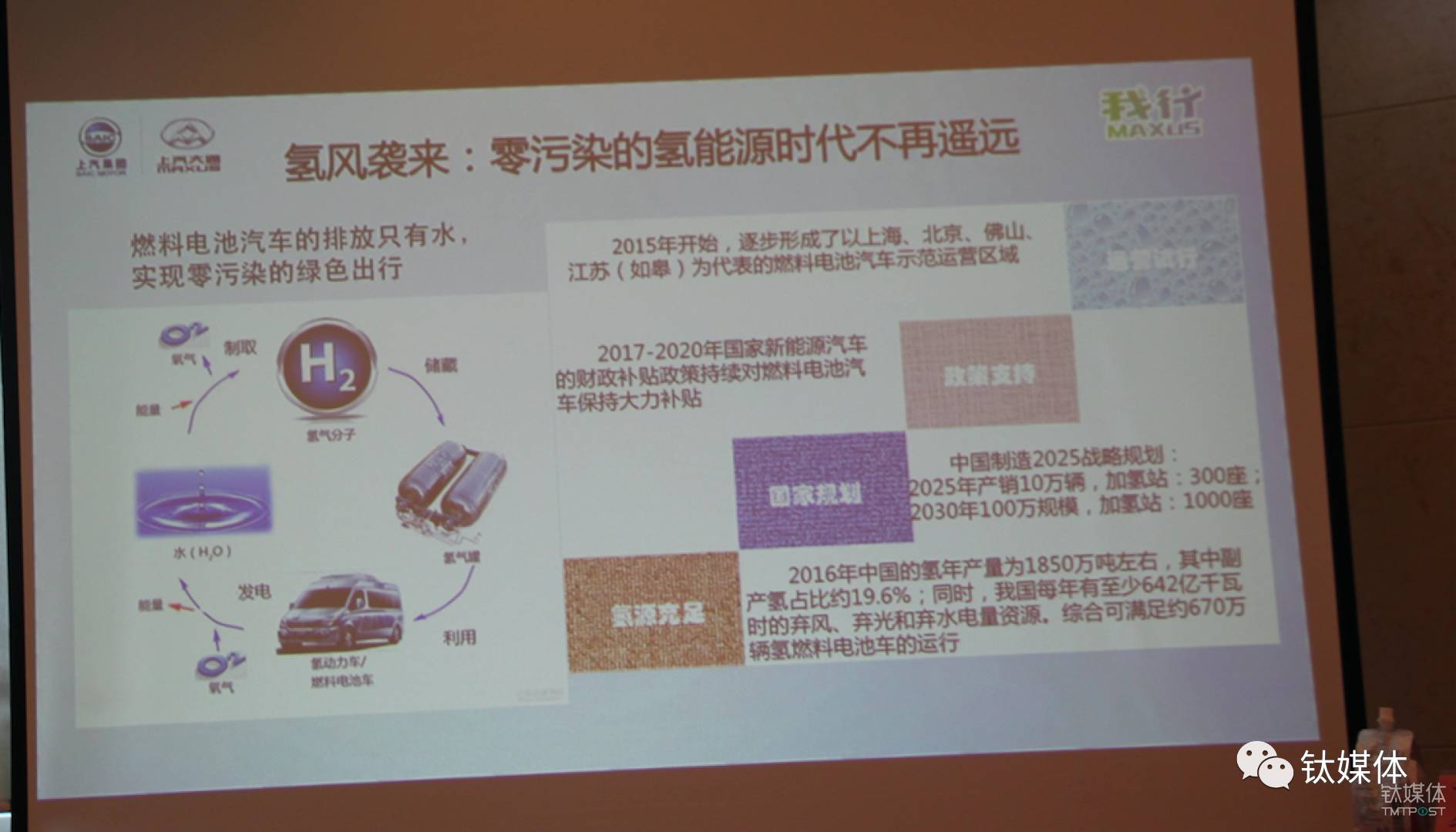 “客车、公交车这种商用车,符合氢燃料的特点。” 上汽大通汽车有限公司新能源项目平台总经理于新瑞告诉钛媒体,“首先,氢燃料电池车的氢反应堆很占空间,商用车有这方面的优势,其次,商用车的使用环境相对标准化,走固定的路线,加氢站的设计分布也相对容易。”