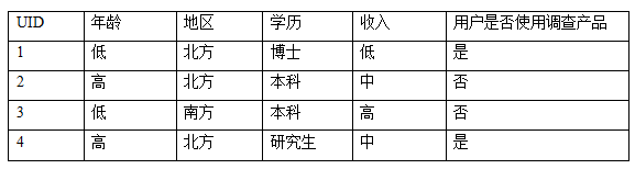 如下表是用户是否使用某产品的调查结果( )请计算年龄、地区、学历、收入中对用户是否使用调查产品信息增益最大的属性。(