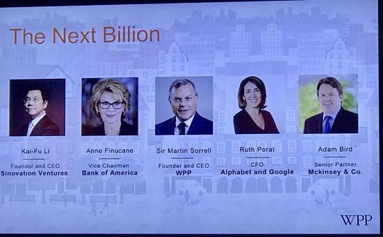 达沃斯当地时间1月25日,在WPP董事长Sir Martin Sorrell亲自主持的 “下十亿用户” 论坛上,创新工场董事长李开复,Alphabet、谷歌首席财务官Ruth Porat,美国银行副董事长Anne Finucane,麦肯锡资深合伙人Adam Bird进行了对谈。