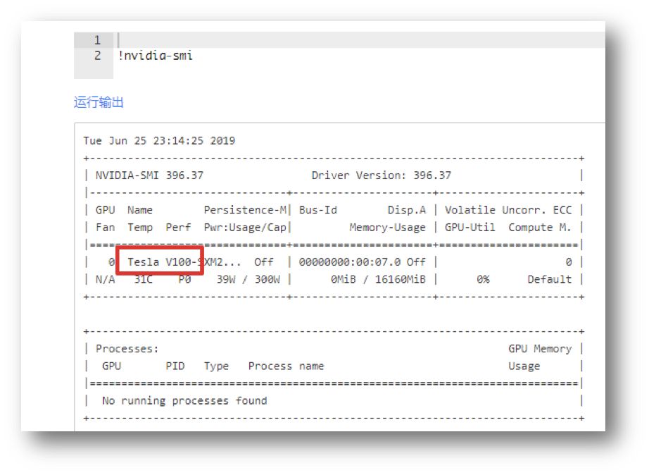 6、此时可以进行校验:使用代码查看环境, 确定使用的是的英伟达Tesla V100显卡。就可以放心开始进行项目了。