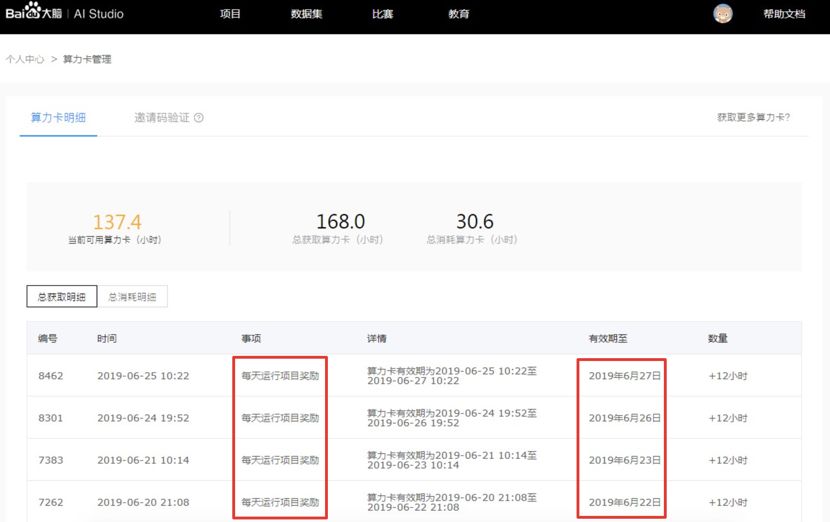 每日连续使用单机GPU环境进行训练, 累计5天后, 用户账户将自动获得48小时算力卡, 这48小时算力的有效期为7天。