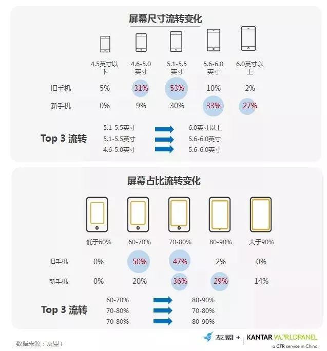 7、用户的手机屏幕集中向大于5.6寸和70%以上屏占比转化