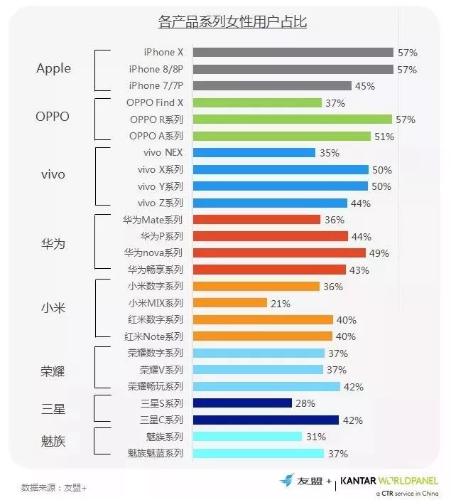 iPhone X/8系列和OPPO R系列的女性用户占比最为突出;
