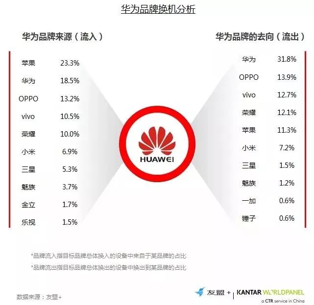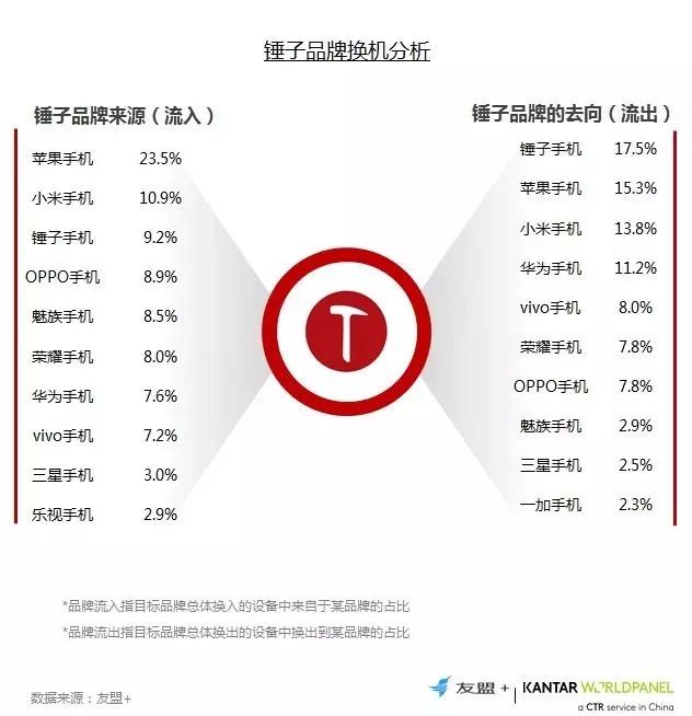 17、换机流向分析:与一加类似,锤子最大的流入来源是苹果;品牌换机忠诚度相对较低