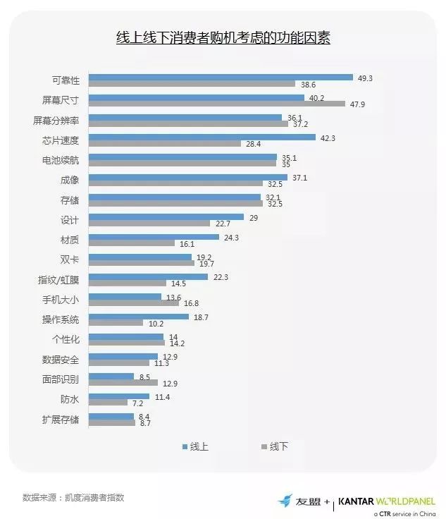 7、线上用户更关心可靠性和芯片速度,线下用户更重视屏幕尺寸