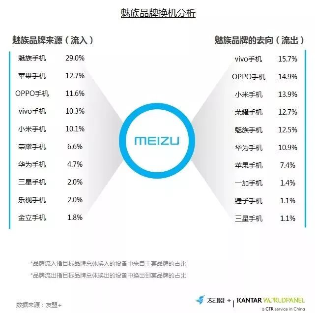 18、换机流向分析:魅族流向情况不太理想,相比于29%的流入,流出到品牌自身的占比仅为12.5%