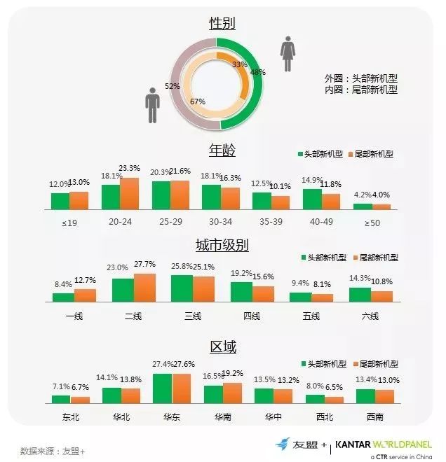 5、头部新机型对不同性别和年龄的覆盖率相对更好,且在渠道下沉方面表现更强