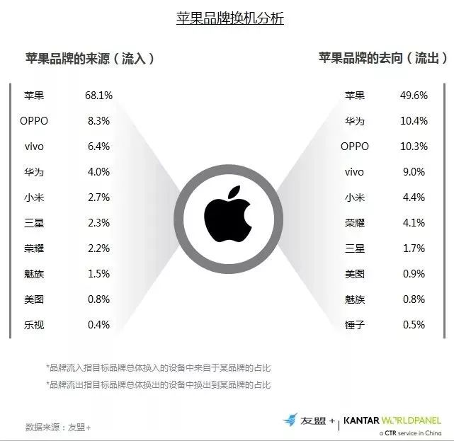 11、换机流向分析:苹果用户流入流出品牌主要都以苹果为主,换机大多在品牌内完成,用户忠诚度高;同时,流出到华为、OPPO与vivo