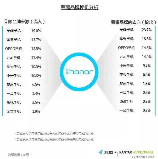 14、换机流向分析:荣耀从自身品牌流入流出的占比低于排名前五品牌;从流入方向上看,各在20%上下