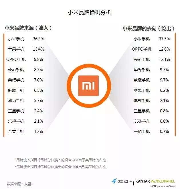 13、换机流向分析:超过1/3的用户在小米自身流转,流入流出比例非常接近,用户忠诚度较好