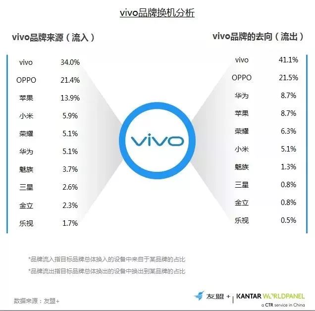 9、换机流向分析:vivo的流入和流出以vivo和OPPO为主,超过55%的流转发生在OV品牌之间