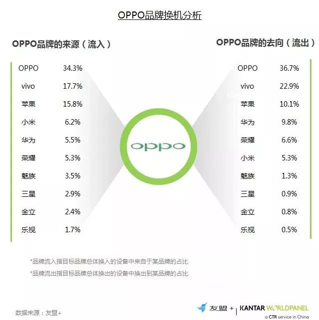 10、换机流向分析:OPPO的换机流向与vivo类似,超过1/3的用户流转发生在OPPO品牌自身,用户忠诚度较高