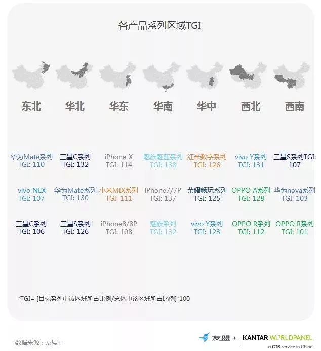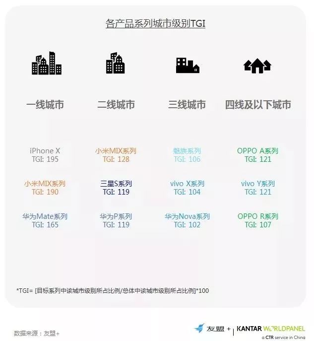 iPhone X、小米的高端MIX系列,三星S系列以及华为Mate/P系列相对聚焦在一二线城市;